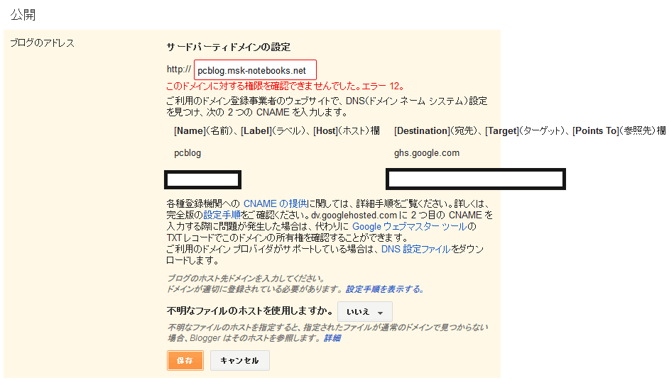Bloggerにログインして、サブドメインを設定(保存)しようとすると、以下のような表示がされるので、これを控えておきます。(ログイン→ブログタイトルクリック→設定→基本→公開→+ ブログのサードパーティ URL を設定 ブログに登録済み URL を使用します。 )